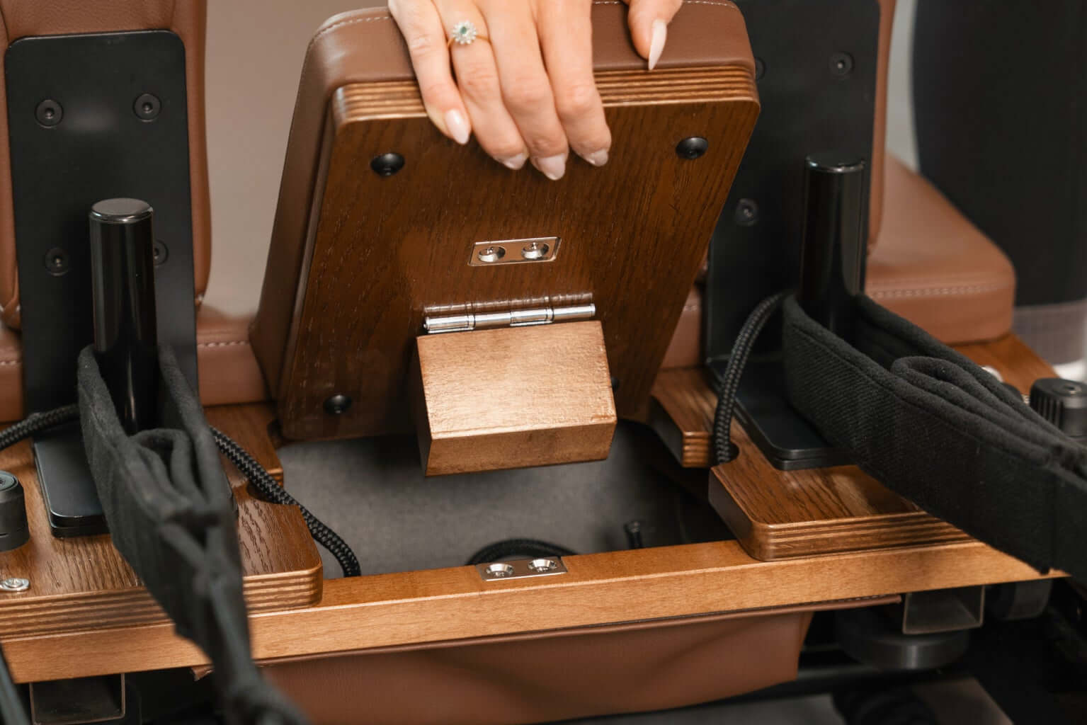 Person using a wooden pilates reformer machine in a home setting